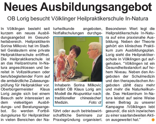 In Völklingen besteht seit kurzem ein neues Ausbildungsangebot im Gesundheitsbereich. Heilpraktikerin Sorina Milkovic hat diese Tage die behördliche Zulassung erhalten, im Stadtteil Geislautern eine private Heilpraktikerschule zu eröffnen. Die Heilpraktikerschule ist an das Heilzentrum In-Natura angeschlossen und bereitet auf die amtsärztliche Zulassungsprüfung für Heilpraktiker vor. Außerdem werden Fortbildungskurse in vielen Bereichen der Naturheilkunde angeboten, Notfallschulungen durchgeführt oder auch betriebswirtschaftliche Seminare zur Praxisgründung organisiert.